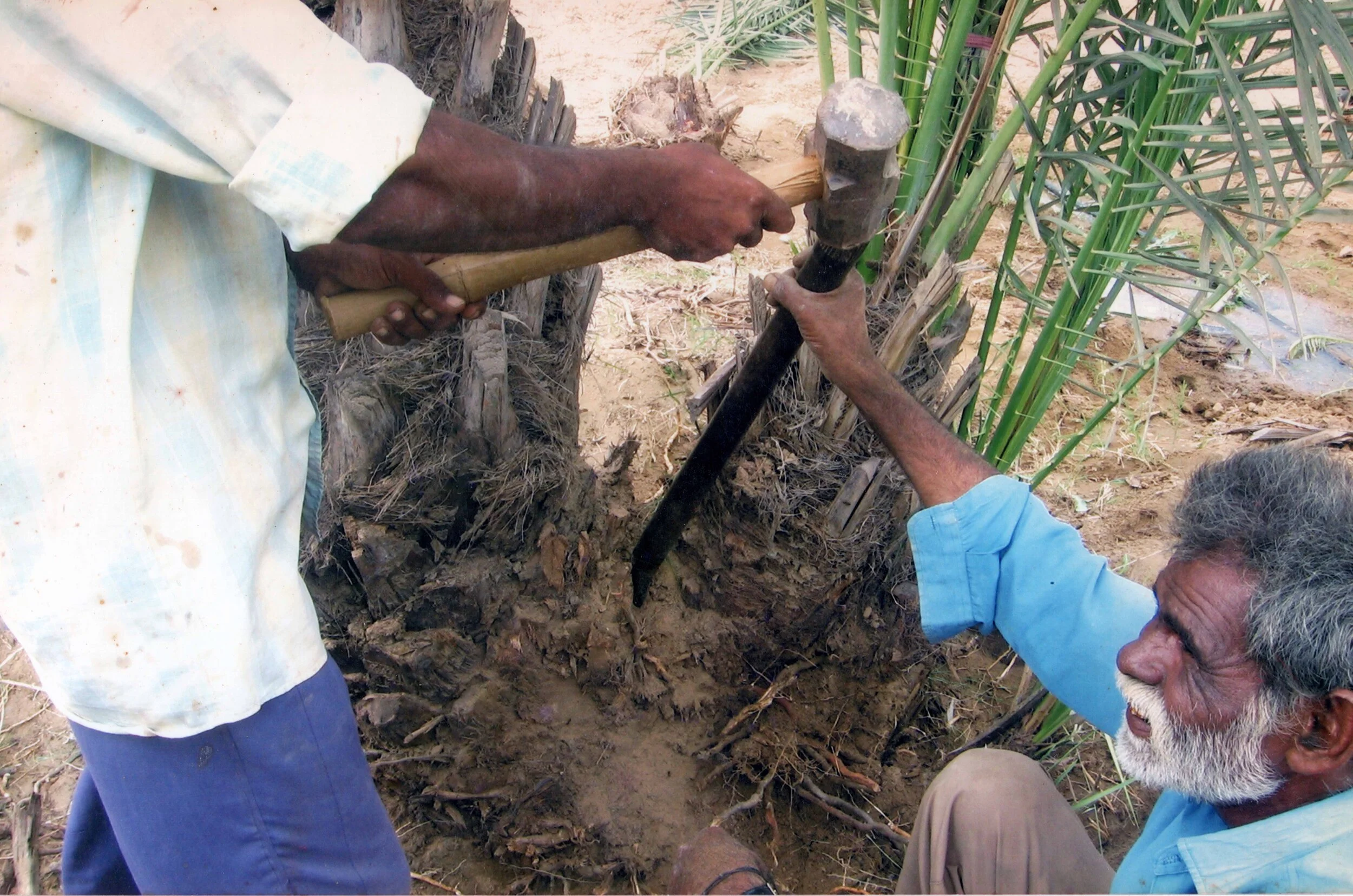 By using chisel and hammer cut the joint without damaging the mother palm or offshoots.
